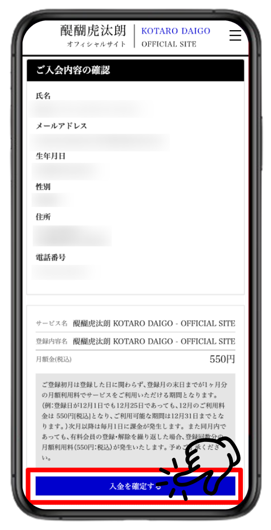 ⑧ご入会内容を確認し、「入金を確定する」をタップ